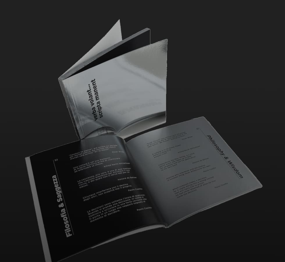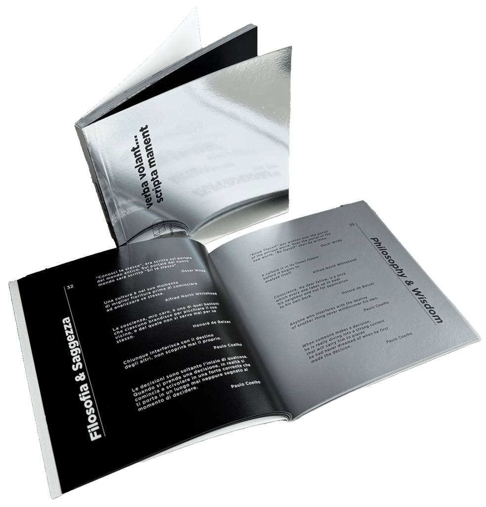 The Aphorisms books have been conceived for the VIP guests of the two 5 Stars Luxury hotels of the Collection enhancing the brand identity through a captivating layout that alternates silver and black colors. We have selected aphorisms from prominent intellectuals, poets, thinkers, artists, and authorities subdivided into different topics such as Philosophy and Wisdom, Men & Women, Life, …….